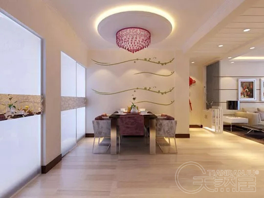 桌椅、餐具等已經讓就餐氛圍熱鬧起來,墻面便可盡量簡潔有趣,與環境融合尤為重要,色彩圖案不同的餐廳能給人帶來不同的感官刺激,照顧你的味蕾。餐廳是與客廳緊密相連的次空間,對于花色的選擇需要謹慎,紅色使人興奮,綠色保持食欲,鵝黃韻味悠長…… 獨立餐廳可以四壁滿鋪,就餐區可以單面墻整鋪或局部鋪貼。用色活潑能激發食欲,純色墻面顯得干凈質樸,雅致圖案則更凸顯家人團聚的溫馨。
